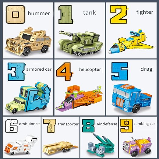 1️⃣ 10‑in‑1 Transformations – Five numbered vehicles morph individually and unify into one large robot.